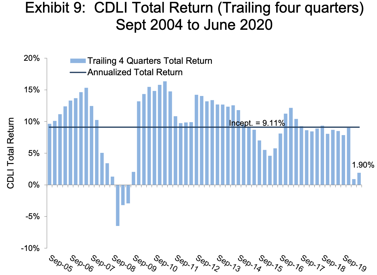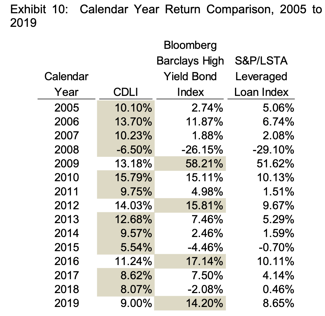 ** This is an index of private loans with data since 9/30/2004. The CDLI Index is unlevered, while some current private debt funds use some amount of leverage, up to 1.0x. No fund manager fee is deducted for CDLI, because in practice the fund manager fee is offset by a small amount of fund leverage, increasing the gross return for the fund. On a net basis, the total return from funds is near to the CDLI return.Details here.