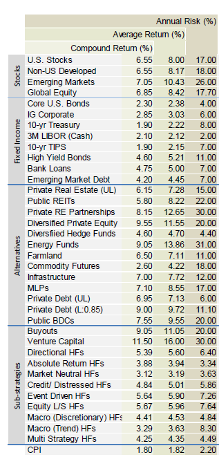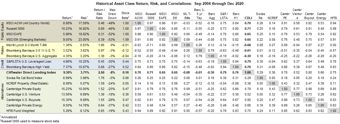 Asset Class Historical Performance is taken from the below chart, updated annually by Cliffwater. Latest data as of 12/31/2022.